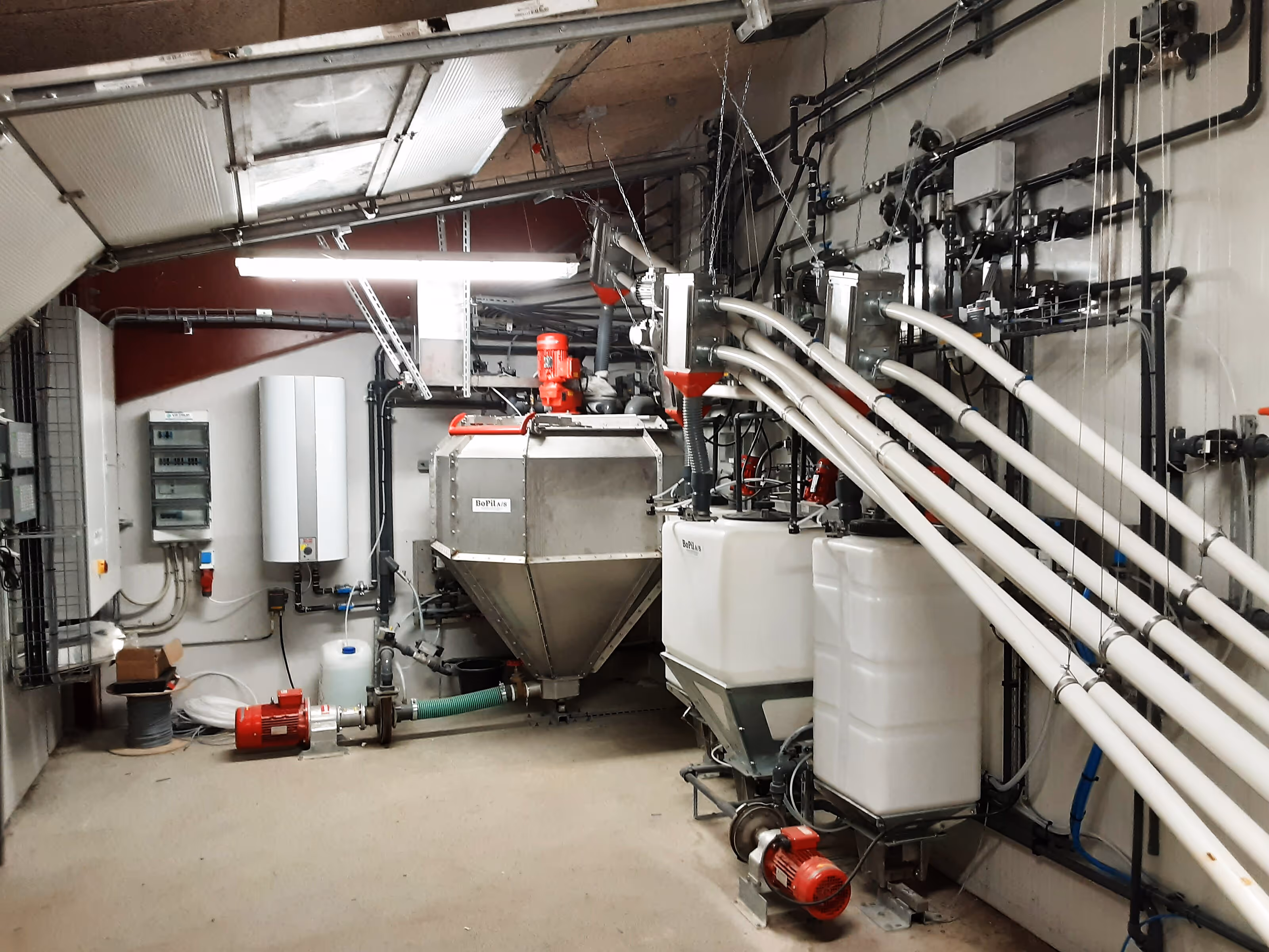 Udfodring sker efter størrelse, behov og med censor i trug. Rengjøringen er nem og hurtig — anlægget kører automatisk rengjøring og desinfektion med syre og base.